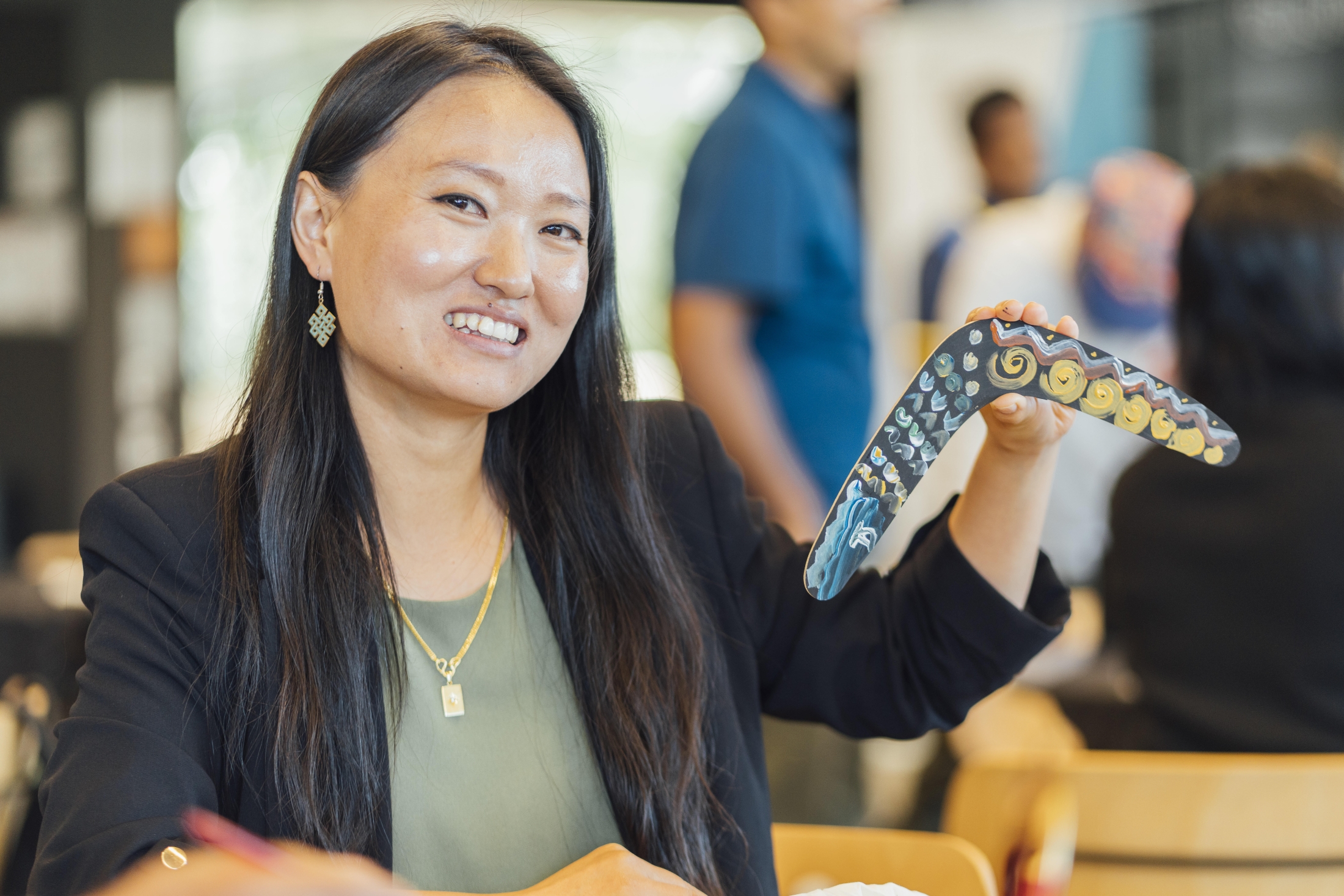 Tashi Dema holds up the boomerang she painted at the Brisbane Symposium.
